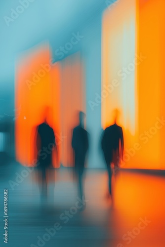 Blurry silhouettes of people walking in night-lit atrium, glowing panels, light trails, immersive atmosphere
