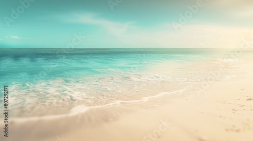 Blurry tropical beach with bokeh, sun light, waves, abstract background, copy and text space, 16:9