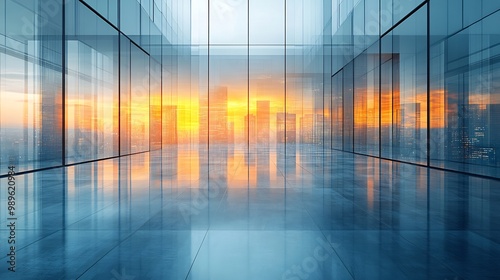 Blurry view of futuristic openplan office captured with tiltshift photography to highlight floating workstations and glowing digital interfaces