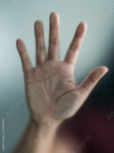 Blurry woman hand behind frosted glass metaphor panic and negative dark emotional