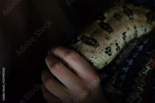 Boa constrictor imperator normal. Exotic animals in the human environment. Snake on a dark background.