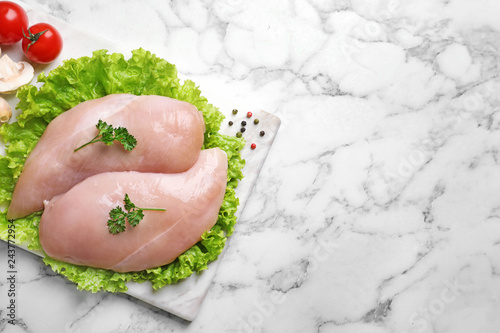 Board with raw chicken breasts and ingredients on marble background, top view. Space for text