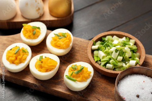 Board with stuffed eggs, salt and green onion on dark wooden background. Easter celebration