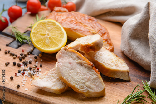 Board with tasty chicken fillet on wooden background