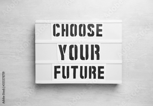 Board with words CHOOSE YOUR FUTURE on white wooden background, top view. Career concept