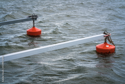 boat mooring bars in the water on red buoys, summer day