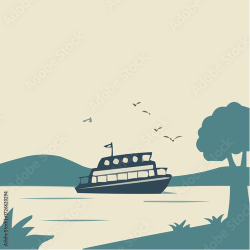 Boat sailing on a calm lake surrounded by nature, evoking tranquility and adventure, flat design style, copy space