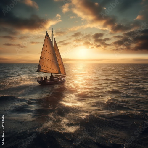 Boat with a sail at sunset on the high seas . generative AI
