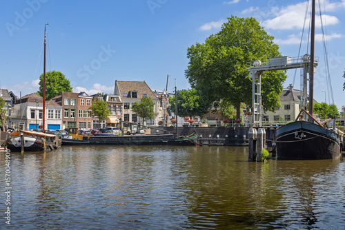 Boats are tied along the museum harbor in Gouda, with a bridge and a row of historic Dutch buildings creating a picturesque backdrop.