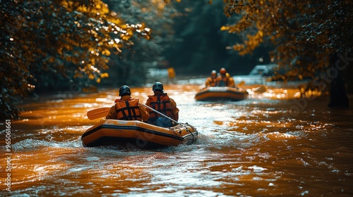 Boats engaged in rescue operations during a flood, high water levels, evacuation efforts, dramatic water conditions, high-resolution details of emergency response, copy space for relief updates,