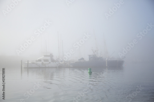 Boats in fog docked in morning sunrise at Monterey Bay in California