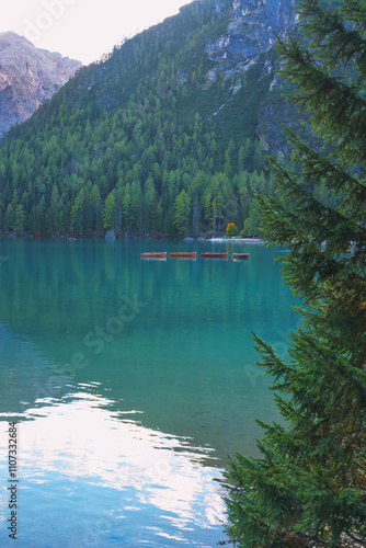 Boats on the Braies Lake ( Pragser Wildsee ) in Dolomites mountains, Sudtirol, Italy