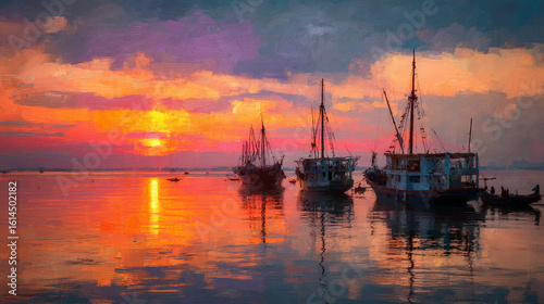 Boats silhouetted against a vivid sunset reflecting on the water creating a serene seascape