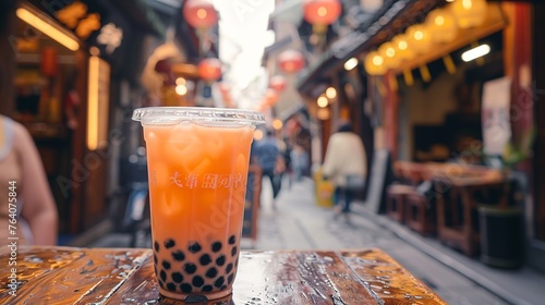 Bobba tea or bubble tea with Asian city in the background with copyspace, generative ai