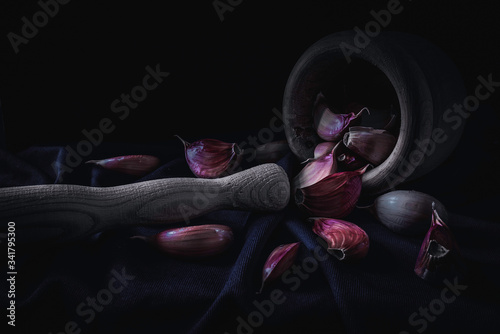 bodegón de ajos con mortero en fondo negro y mantel morado. Allium sativum