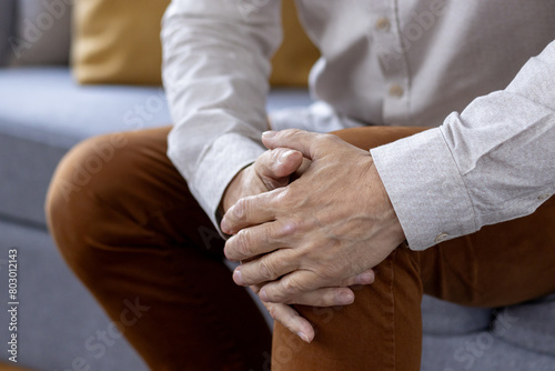 Body part photo, hands of senior man holding knee of leg in brown pants, feeling severe pain and sprain