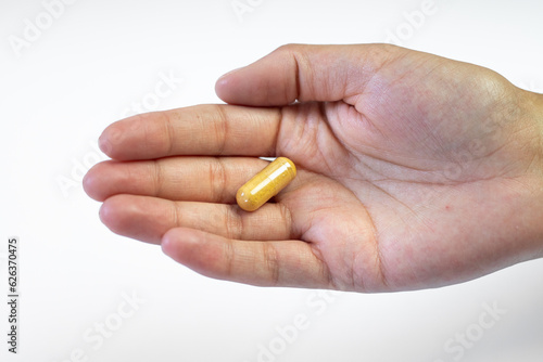 Body support with supplements, ashwagandha capsule held in hand on a white background