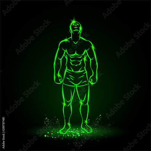 Bodybuilder outline silhouette. Muscular man posing with head up. Vector green neon illustration on black background.
