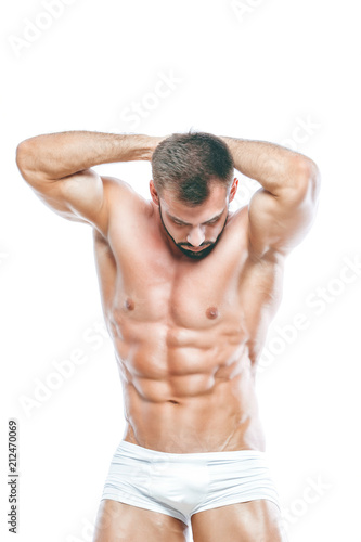 bodybuilder posing. Beautiful sporty guy male power. Fitness muscled manin white lingerie. on isolated white background.