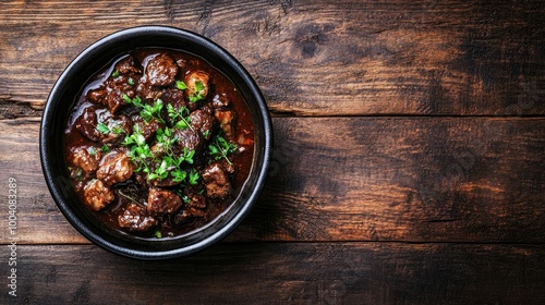 Boeuf Bourguignon served in a dark ceramic bowl, placed on the bottom half of a rustic wooden table, leaving ample room above for text or menu descriptions.