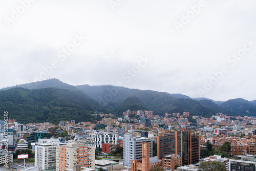 Bogota cityscape with buildings expanding towards the green mountains under an overcast sky