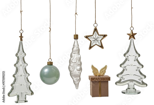 Bohemian Glass Christmas Ornaments: Star, Ball, Santa, Gift Box, Angel Wings, Aesthetic, Artisan, Handmade, Detailed, White Background