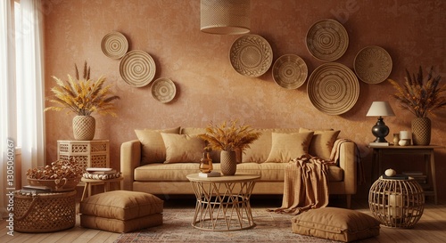 Bohemian Style Living Room with Woven Decor and Neutral Tones