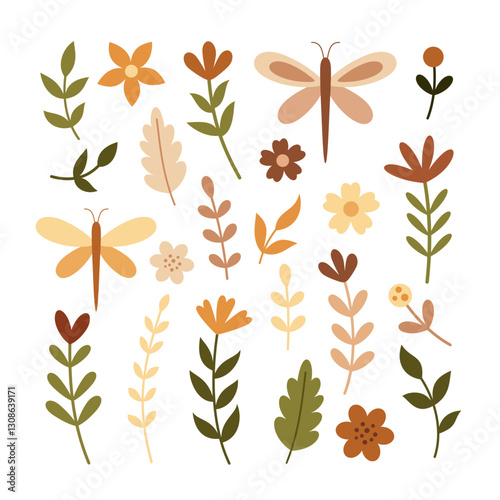 Boho floral clipart set, seasonal leaves, flowers, branches and butterfly. Vector illustration in pastel cartoon style