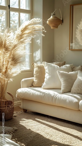 Boho Interior Photo - Sun Drenched Living Room with Pampas Grass and White Sofa