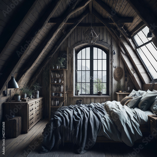 Boho Rustic Modern Interior Design Of Bedroom In Attic, Triangle Ceiling With Wooden Beams, Window With Sun Light, Generative AI