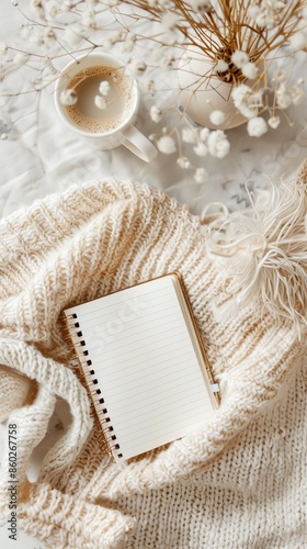 Boho style modern minimal home workspace desk with notebook, cup of coffee, white blanket, dry flowers and feminine accessories. Flat lay, top view