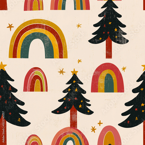 Boho style pine trees and rainbows - seamless pattern with christmas trees
