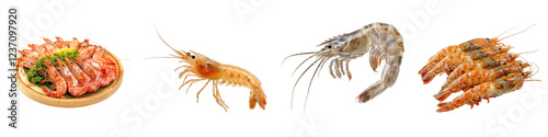 Boiled shrimp isolated on transparent background, PNG, Set of