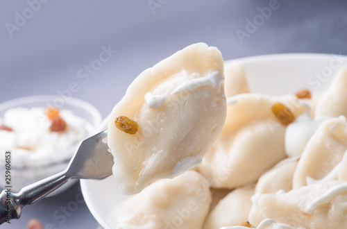 boiled sweet dumplings with filling and sauce on a fork on the background of a full plate