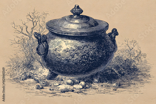 Boiling witch's cauldron hand drawn ink sketch. Engraving style vector illustration.
