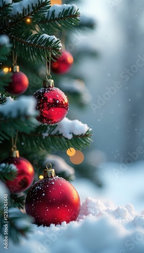 Bokeh Christmas balls and fir branches in a snowy scene, balls, bokeh, frosty
