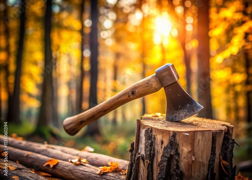 Bokeh Photography: Sharp Axe, Blurred Forest Background - Lumberjack Tools, Woodcutting, Rustic, Nature