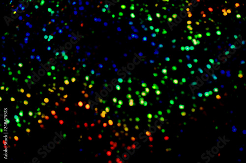 Bokeh, starry multicolored background in blur. Bright little lights on a dark background. The concept of the solar system