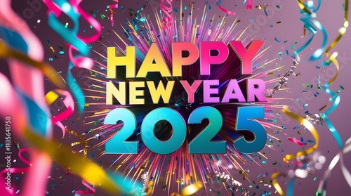 Bold 3D "Happy New Year 2025" with glowing colors and confetti