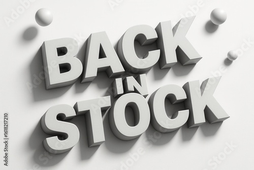 Bold 3D text reading "BACK IN STOCK" with a modern, grayscale design set against a light background, emphasizing product availability and restocking.