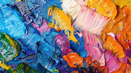 Bold abstract oil painting with vibrant brush and palette knife textures on canvas. Rich, multi-colored acrylic background in close-up. Modern art style. Horizontal fragment.