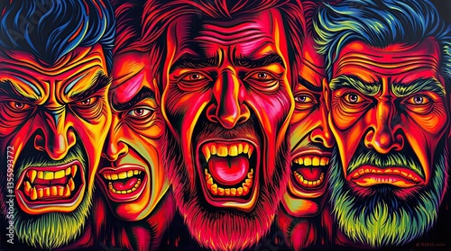 Bold and colorful artwork depicts five expressive faces conveying emotions of rage and intensity showcasing vibrant colors and intricate details in the artwork