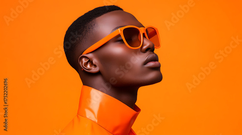 Bold and vibrant, a profile of style against a striking orange backdrop. Retro glasses and a modern top blend into a fashion-forward statement.