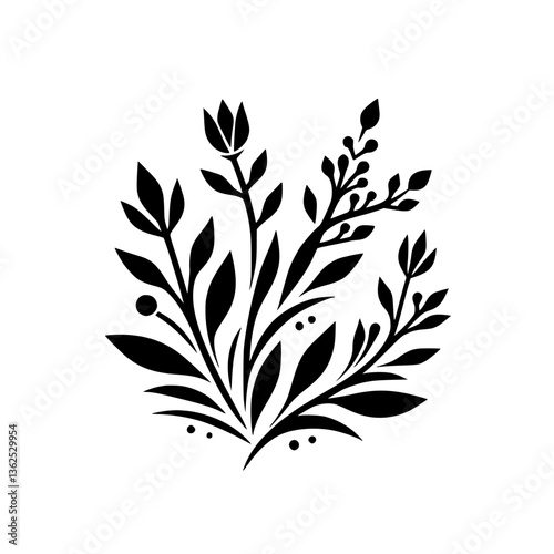 Bold Black Floral Silhouette, a symmetrical arrangement of leaves, buds, and stylized flower on white background, perfect for minimalist design or emblem use.
