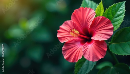 Bold blooming hibiscus, lush tropical leaves, vibrant color palette, exotic, summer