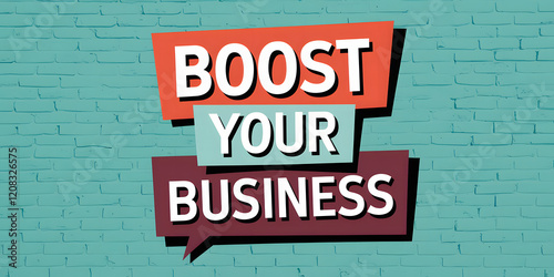 Bold "Boost Your Business" text in colorful speech bubbles on a turquoise brick wall. Vibrant and modern design for advertising or marketing campaigns.