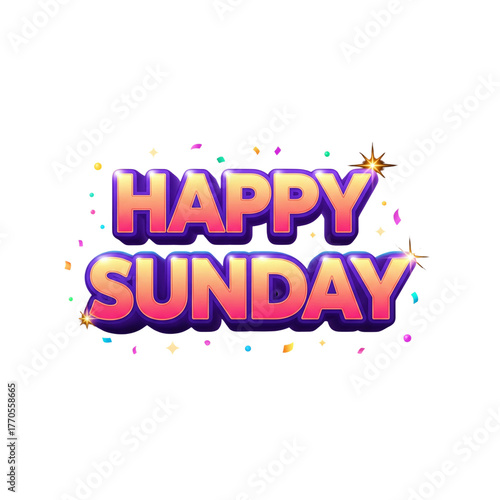 Bold colorful Happy Sunday 3D text with sparkles and confetti