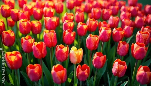 Bold, densely packed tulips in vibrant colors, geometric layout , leaves, spring, colorful