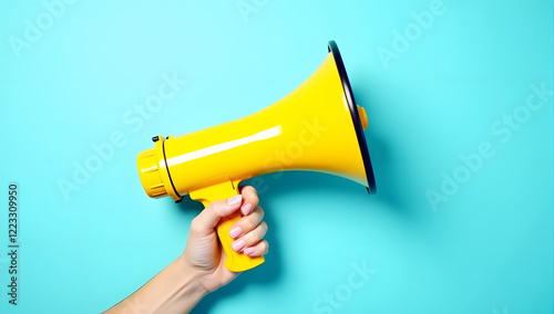 Bold yellow megaphone on a vibrant blue background perfect for communication, marketing, announcements, or promotional campaigns with a modern, eye-catching design