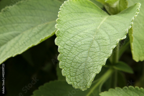 Boldo leaf (Peumus boldus) with the grooves of its leaves and the characteristic hairs of the plant